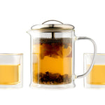 The set includes one 15 oz double wall teapot with strainer lid and two 4 oz double wall tea cups. All products are made from BPA free borosilicate glass. Double wall glass keeps the tea hotter longer. The teapot has an ultra-fine mesh stainless steel strainer lid to filter the tea leaves when pouring. The teapot has plenty of room for the tea leaves to expand and bloom.