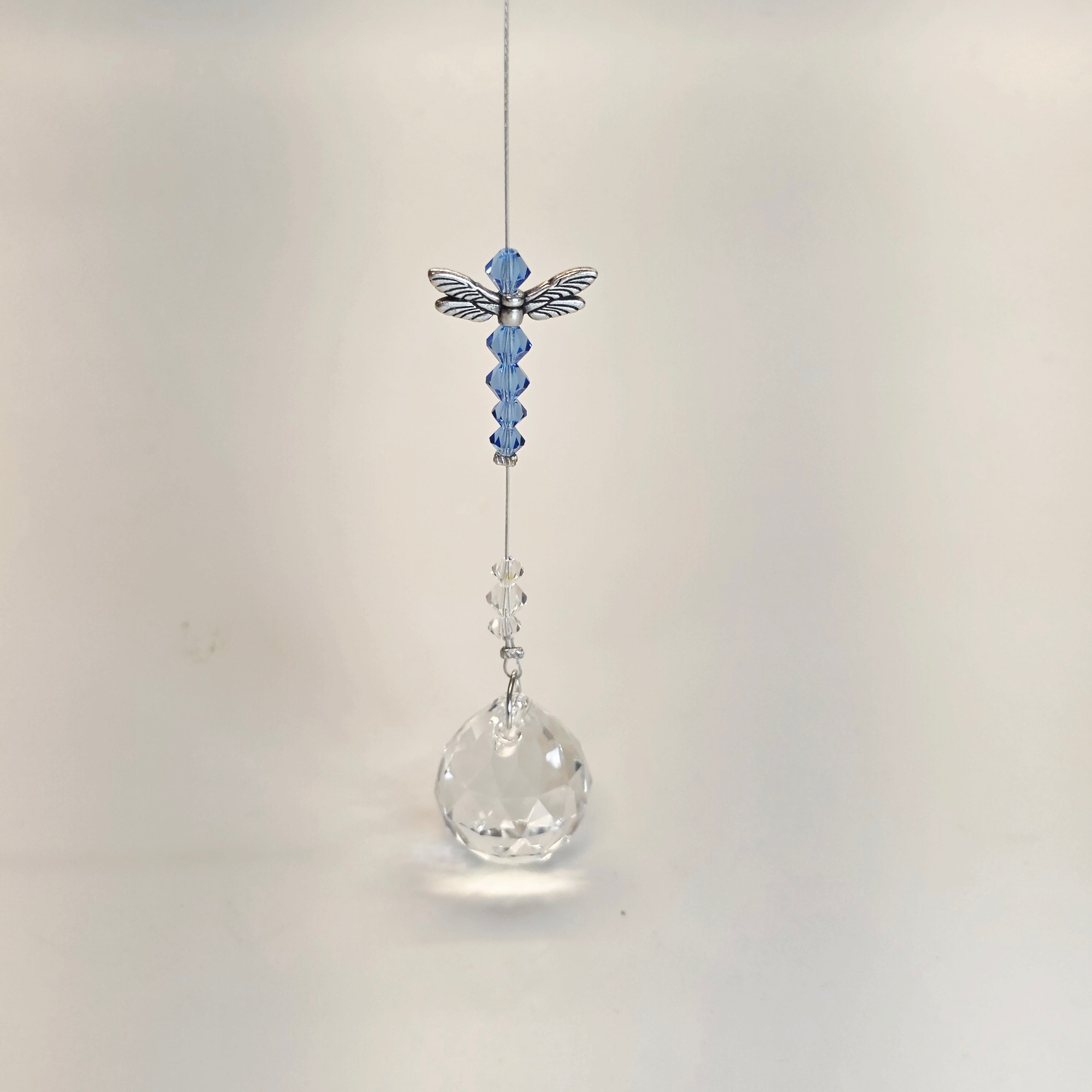 Hebra atrapasueños con dije de libélula de metal y cristal con prisma de bola facetada de 20 mm. El producto viene en varios colores de cristal. Hecho a mano en los EE.UU.