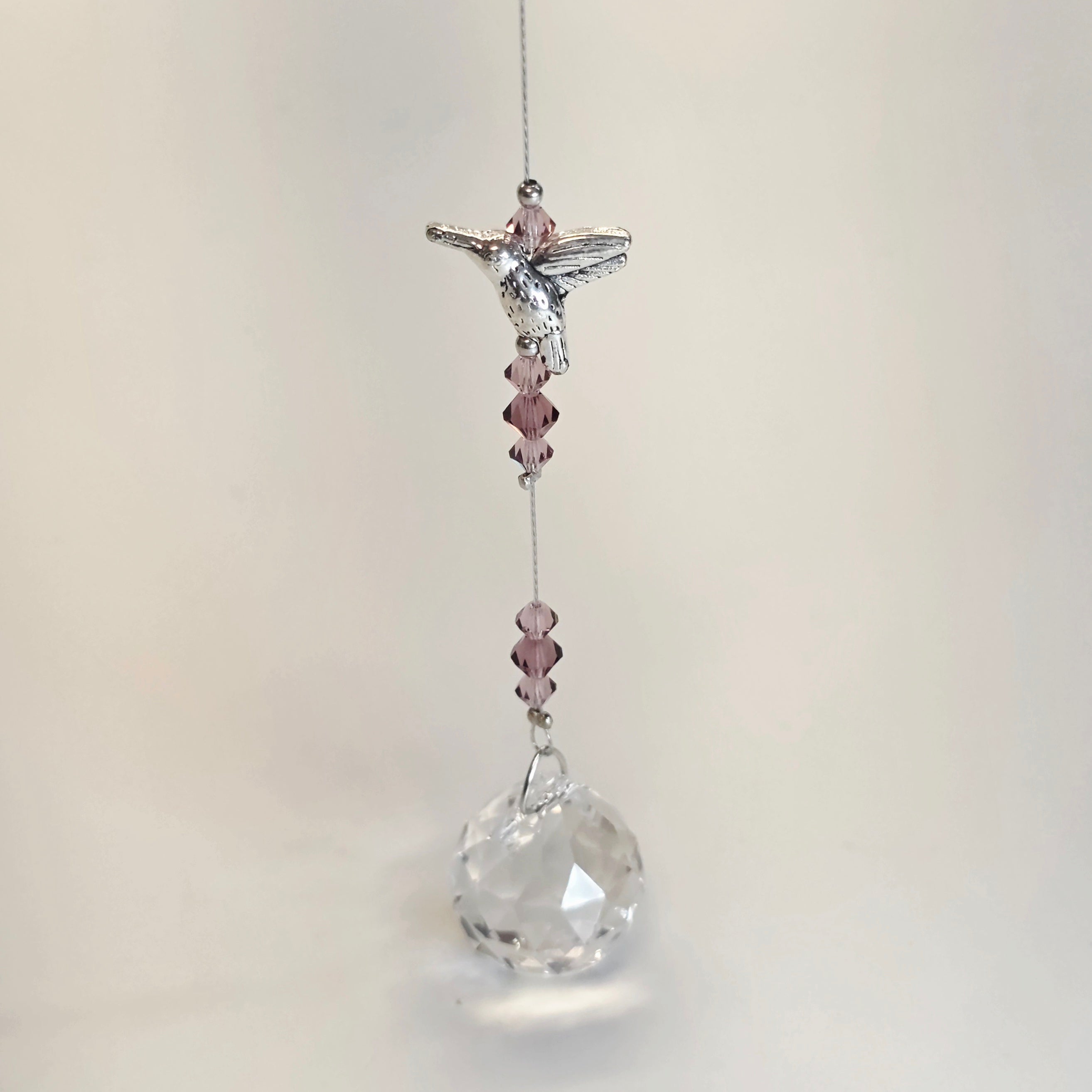 Metal and Crystal Dragonfly Charm Suncatcher strand with 20mm faceted ball prism. Product comes in assorted crystal colors. Handmade in the USA.